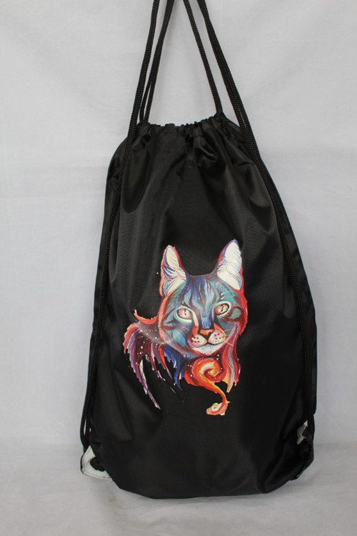 Batoh- vak, bez podšívky, stahování na šňůrku. Šňůrku je možné zkrátit dle potřeby. Je nepromokavý, vhodný na věci pro volný čas, na sport či na procházky. Na přední straně je obrázek . Uvnitř je jedna kapsa na zip pro doklady a mobilní telefon. Rozměr kapsy je 23 x 29 cm. Zadní strana je černá. Vyroben ze 100% polyesteru.