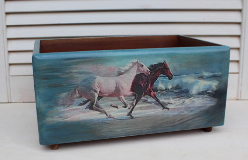 Dřevěný box se dvěma otvory. Je zdobený pomocí různých technik, hlavně technikou transfer obrazku a ruční malbou. Uvnitř je mořený a lakovaný. Je vyrobený ze smrkového ručně drásaného a broušeného dřeva a tak, aby vypadal starobyle. Trhlinky, šmouhy či patina tedy nejsou vadou, ale znakem originality produktu. Škrábance a nerovnosti dodavají starobylý vzhled tomu to boxu. Box bude originálním a funkčním doplňkem v interiéru.