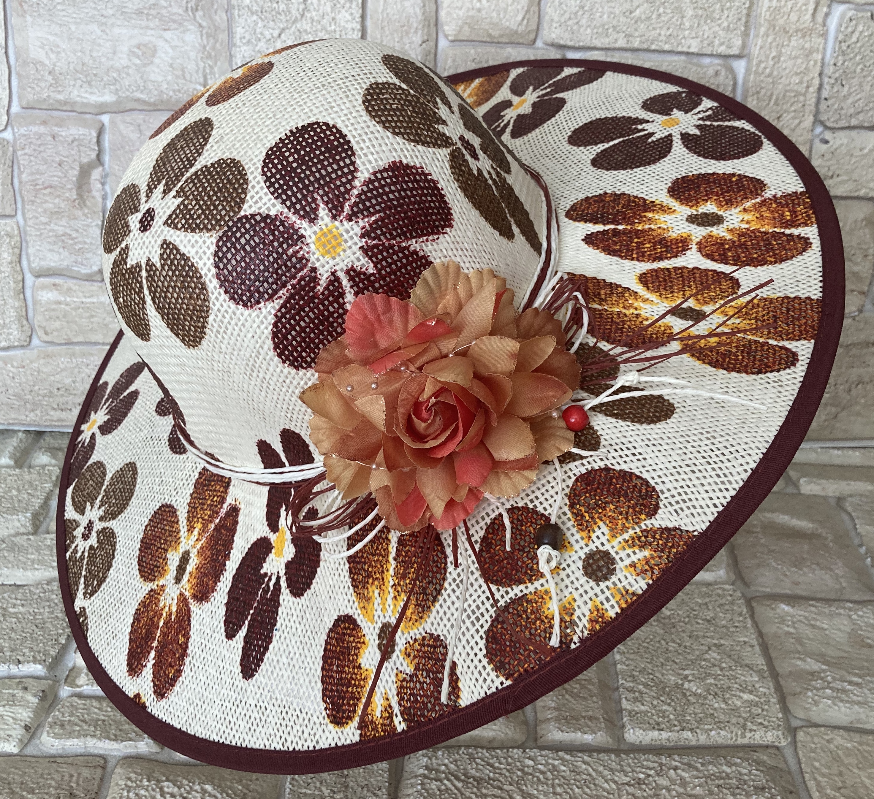 Dámský letní klobouk s širokou krempou. Nezmění tvar, když ho zmačkáte a strčíte do tašky, nebo budete chodit venku v dešti, a dokonce ani pokud Vám spadne do vody, třeba na dovolené u moře. Ozdobu lze sundat a dozdobit dle vlastního vkusu mašlí, stuhou či broží a vytvořit si tak jedinečný designový doplněk. Můžete se v něm předvádět na pláži, nebo také poslouží jako skvělý doplněk na večer k letním šatům.