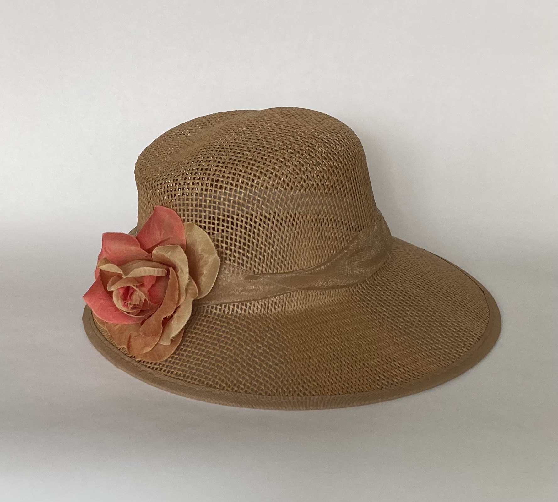 Dámský letní klobouček s lehce prodlouženou krempou vpředu. Ozdobu lze sundat a dozdobit dle vlastního vkusu mašlí, stuhou či broží a vytvořit si tak jedinečný designový doplněk. Můžete se v něm předvádět na pláži, nebo také poslouží jako skvělý doplněk na večer k letním šatům.