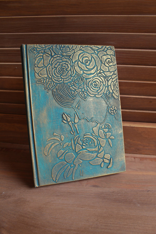 Zápisník poznamkovník diář zdobený technikou dekorování se starožitným efektem. Je natřen akrylovými barvami, patinovaný voskem a důkladně přelakován akrylovým lakem.