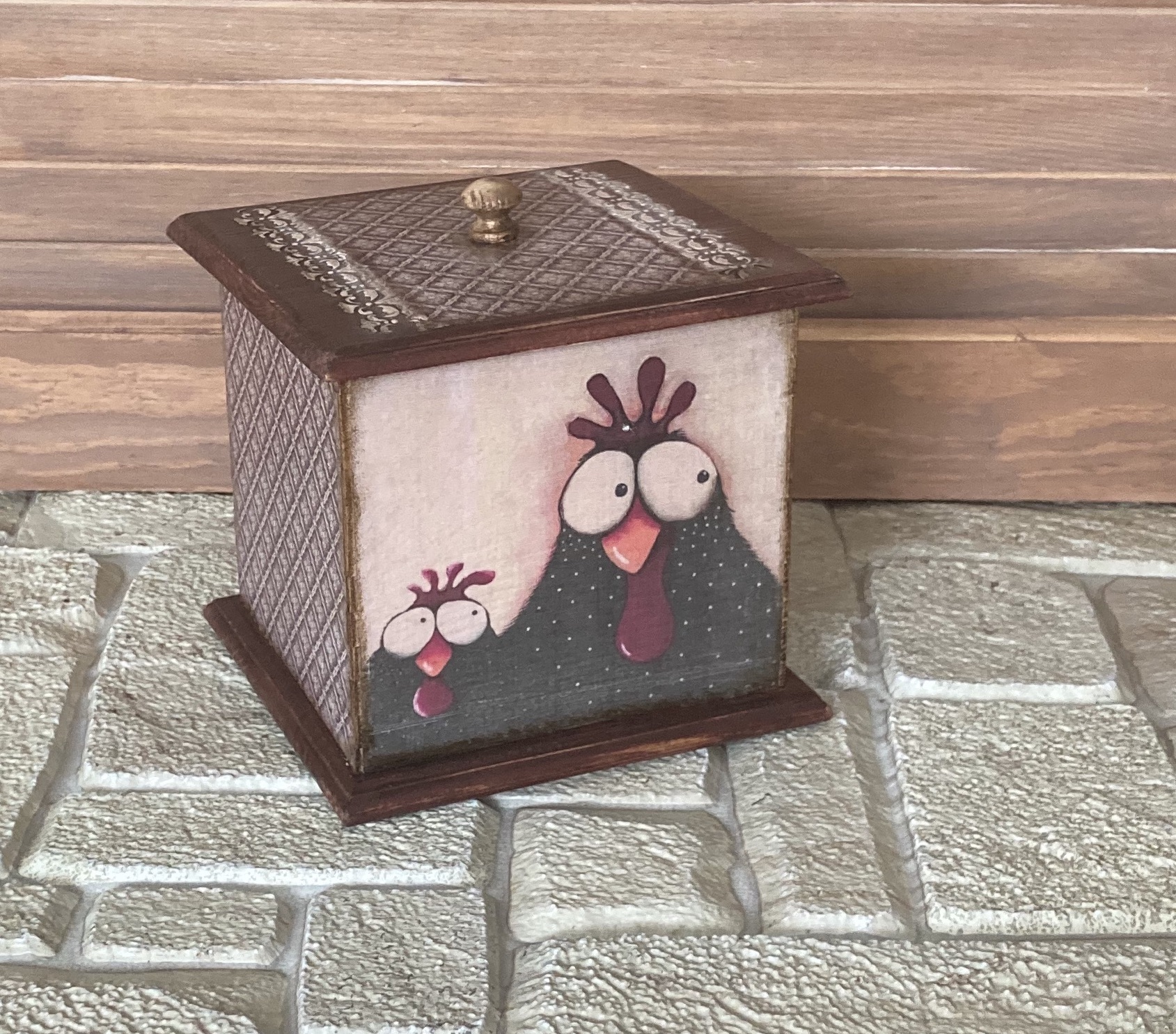 Je zdobena ve stylu vintage pomocí různých technik, hlavně technikou decoupage a ručně domalovaná. Povrch je lakován kvalitním akrylovým lakem. Uvnitř je přírodní. Lze otírat vlhkým hadříkem.