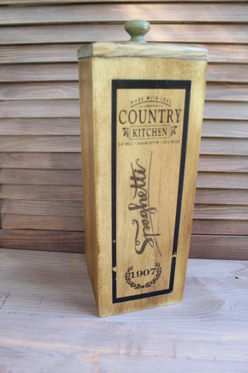 Dřevěná dóza na špagety vyrobená s horním otevíráním. Je zdobena ve stylu Italské Country pomocí různých technik, hlavně technikou decoupage. Povrch je lakován kvalitním akrylovým lakem. Uvnitř je přírodní. Lze otírat vlhkým hadříkem.
