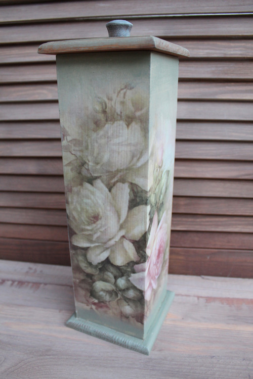 Dřevěná dóza na špagety s horním otevíráním. Je zdobena ve stylu vintage pomocí různých technik, hlavně technikou decoupage . Povrch je lakován kvalitním akrylovým lakem. Uvnitř je přírodní . Lze otírat vlhkým hadříkem .