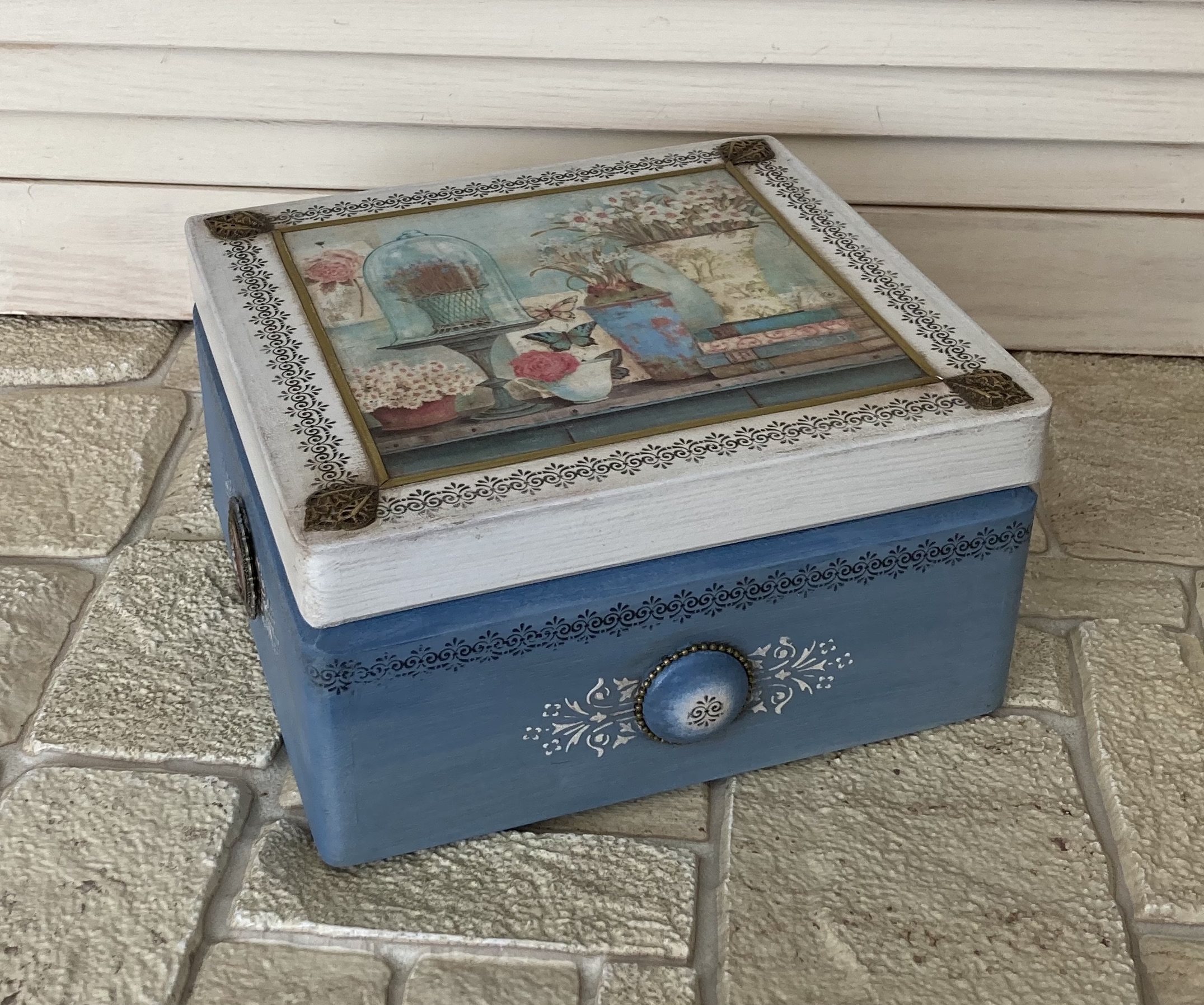 Krabička na drobnosti . Vnější rozměr krabičky je 20,5 x 18,5 x 11 cm. Krabička je mořená, zdobená technikou decoupage, filigraní a objemným ornamentem. Krabička je skvělou dekorací do vaší kuchyně, praktickým kouskem nábytku a může být i skvělým dárkem pro milovanou osobu k jakékoliv příležitosti. Tato nádherná krabička ozdobí každou kuchyň, obývák nebo dokonce bude vypadat krásně na toaletním stolečku v ložnici. Vejdou se do ní všechny potřebné drobnosti, ale i potravinářské produkty, jako jsou oříšky, sušenky, sladkosti nebo čajové sáčky. Je ošetřena pomocí materiálů šetrných k životnímu prostředí s atestem pro styk s potravinami.