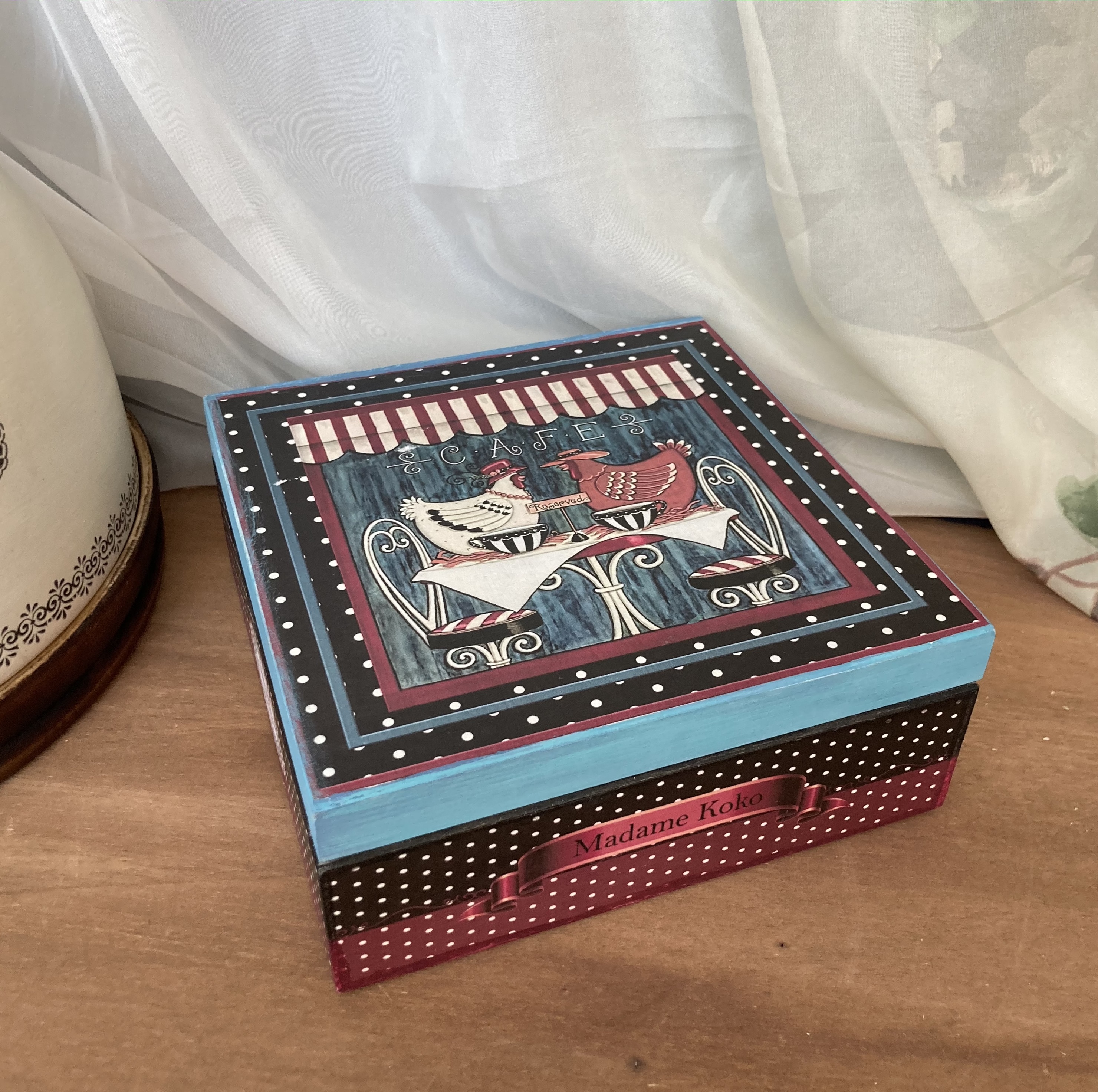 Dřevěná krabička s horním otevíráním ze série "Madame Koko". Je ručně zdobená technikou ručního přenosu obrázků na dřevěný povrch, objemným vzorem na bočních stranách, lakovaná a voskovaná. Všechny materiály jsou zdravotně nezávadné.