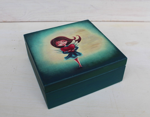 Dřevěná krabička s horním otevíráním. Je ručně zdobená technikou ručního přenosu obrázků na dřevěný povrch a lakovaná. Povrch je lakován kvalitním akrylovým lakem. Uvnitř je přírodní.
