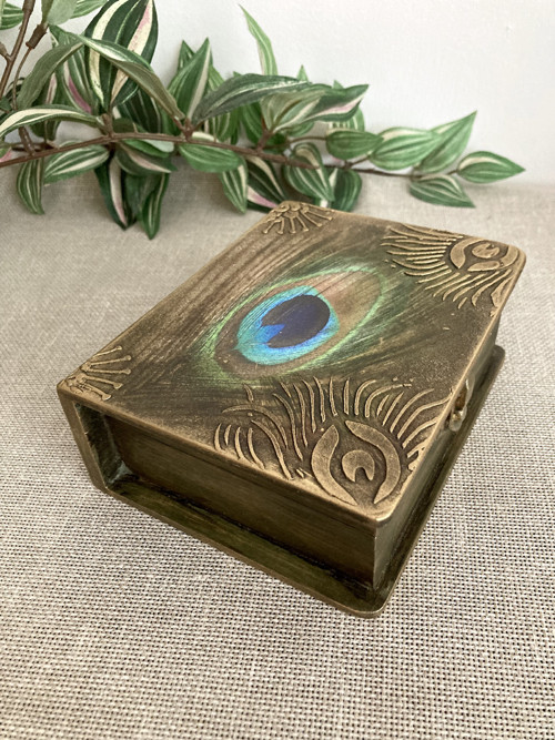 Dřevěná krabička s horním otevíráním ve tvaru knížky, z lipového dřeva a překližky . Je zdobena pomocí různých technik, techniky decoupage, krakelovaním k dosažení starobylého vzhledu, a je mořená a ručně domalovaná . Povrch je lakován kvalitním akrylovým lakem. Lze otírat vlhkým hadříkem. Každý výrobek je originál, drobné odchylky jsou žádoucí. Trhlinky, šmouhy či patina tedy nejsou vadou, ale znakem originality produktu. Škrábance a nerovnosti dodavají starobyly vzhled teto krabičce.