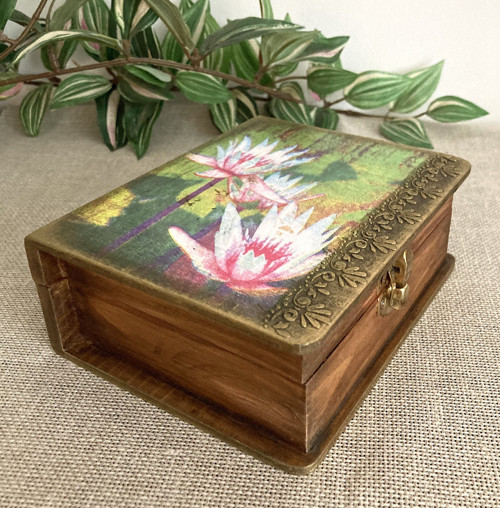Dřevěná krabička s horním otevíráním ve tvaru knížky, z lipového dřeva a překližky. Je zdobena pomocí různých technik, techniky decoupage a ručně domalovaná . Povrch je lakován kvalitním akrylovým lakem. Lze otírat vlhkým hadříkem. Každý výrobek je originál, drobné odchylky jsou žádoucí. Trhlinky, šmouhy či patina tedy nejsou vadou, ale znakem originality produktu.