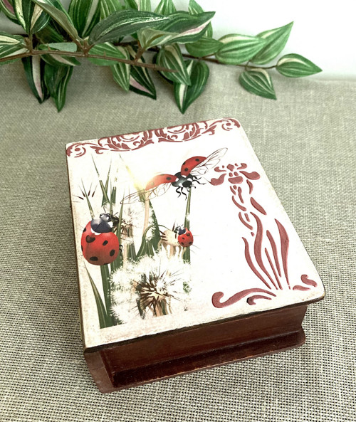 Dřevěná krabička s horním otevíráním ve tvaru knížky, z lipového dřeva a překližky . Je zdobena pomocí různých technik, techniky decoupage, krakelovaním k dosažení starobylého vzhledu, a je mořená a ručně domalovaná . Povrch je lakován kvalitním akrylovým lakem. Lze otírat vlhkým hadříkem. Každý výrobek je originál, drobné odchylky jsou žádoucí. Trhlinky, šmouhy či patina tedy nejsou vadou, ale znakem originality produktu. Škrábance a nerovnosti dodavají starobyly vzhled teto krabičce.