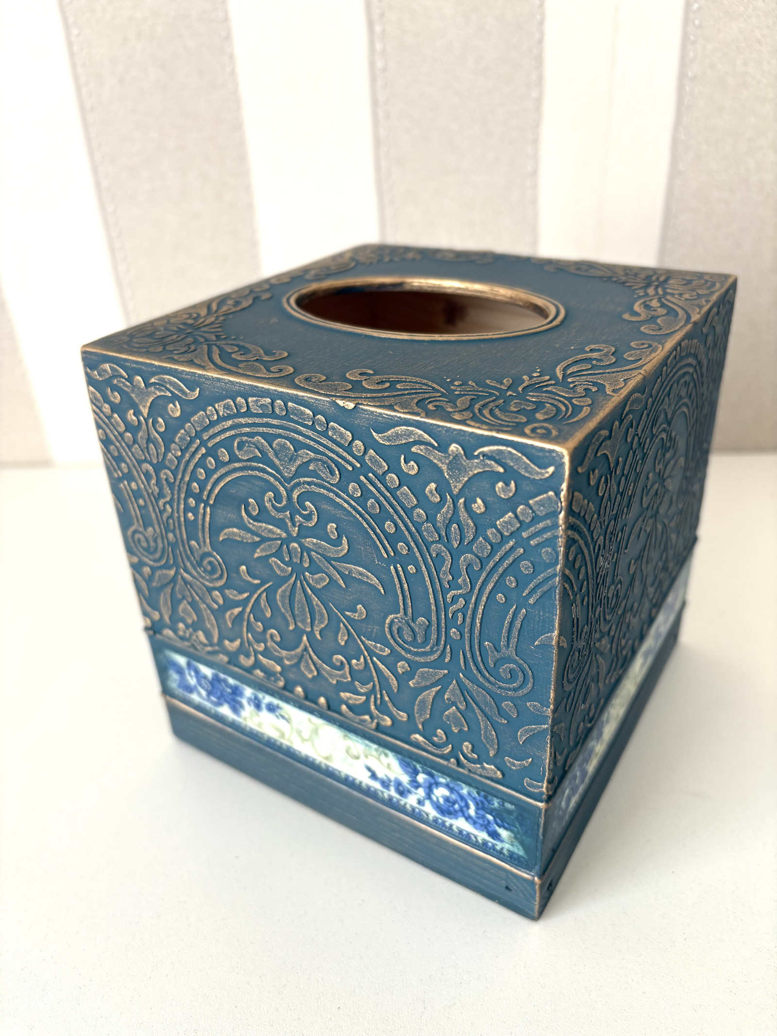 Všechny materiály jsou zdravotně a ekologicky nezávadné na vodní bázi, které jsou bezpečné pro použití. Povrchová úprava vícevrstvým matným lakem dodává pocit jemnosti. Jemný motiv a jemné patinování krabičky na kapesníky ozdobí interiér vašeho stolu v kuchyni nebo toaletní stolek v ložnici. Může se také stát originálním a praktickým dárkem pro vaši rodinu a přátele.
