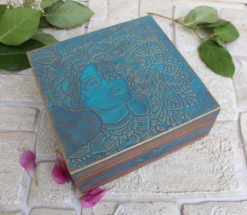 Dřevěná krabička s horním otevíráním. Je ručně zdobena pomocí různých výtvarných technik. Povrch je lakován kvalitním akrylovým lakem. Uvnitř je mořená a lakovaná. Lze otírat vlhkým hadříkem.