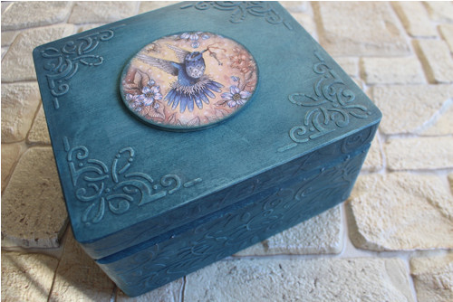 Dřevěná krabička s horním otevíráním. Je ručně zdobena pomocí různých výtvarných technik. Povrch je lakován kvalitním akrylovým lakem. Uvnitř je mořená a lakovaná. Lze otírat vlhkým hadříkem.