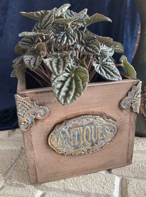 Dřevěný obal na květináč zdobený různými dekoračními technikami, včetně techniky dekorování se starožitným efektem. Keramické ozdoby na květináči jsou ručně vyrobené z kvalitní keramiky s patinováním, takže vypadají jako metalické ozdoby. Květináč je natřený akrylovými barvami, voskem a důkladně přelakován akrylovým lakem. Může sloužit jako květináč na květiny, krabice na domácí potřeby a jako zásobník na různé drobnosti. Dokonale se vejde na kuchyňské okno nebo ozdobí pokoj na venkově! Poslouží jako nádherný dárek pro ženu jakéhokoli věku a pro každou příležitost!
