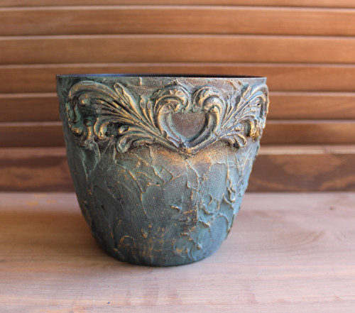 Plastový obal na květináč zdobeny pomocí různých dekoračních technik a techniky dekorování se starožitným efektem. Je natřeny akrylovými barvami, voskem a důkladně přelakovány akrylovým lakem.