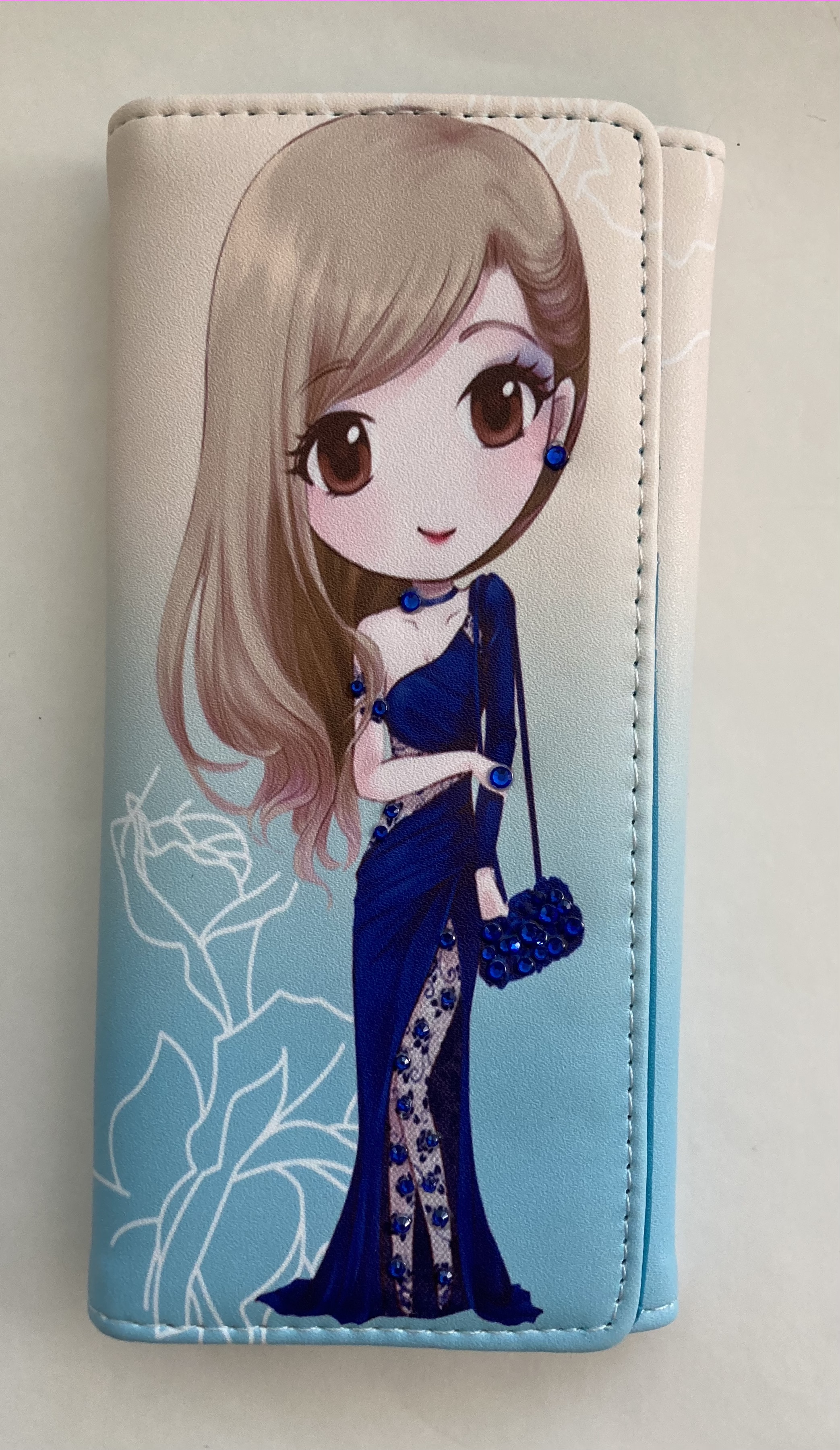Peněženka s obrázkem mladé dívky dekorovaná kamínky a různobarevnými konturami. Obsahuje kapsičky na hotovost i přihrádky na osobní doklady, karty, zákaznické kartičky, vizitky a fotografie.