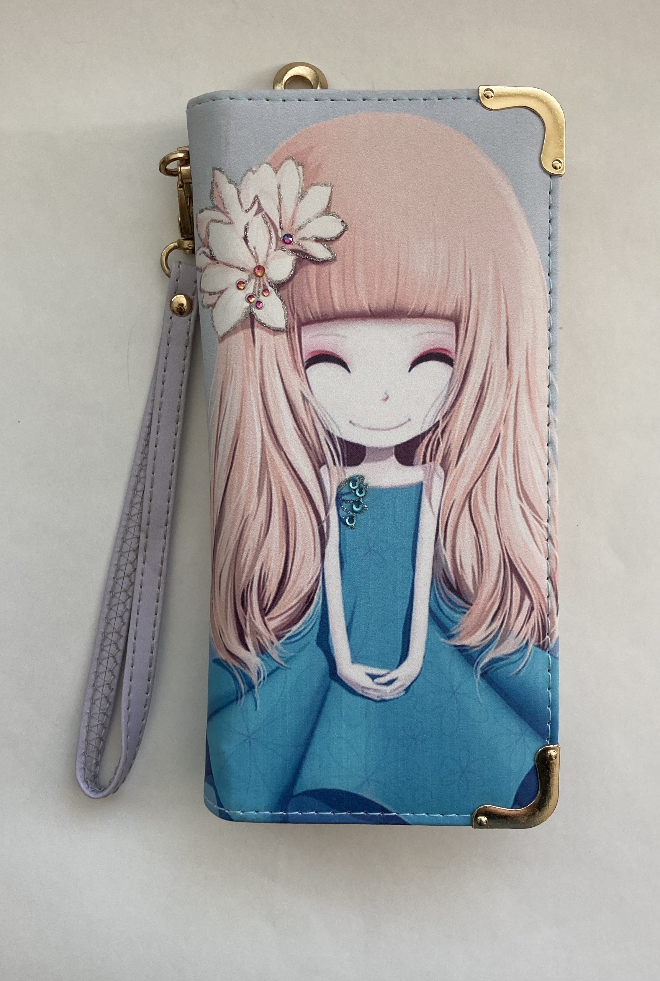 Peněženka s obrázkem mladé dívky dekorovaná kamínky a různobarevnými konturami. Velice kvalitně zpracovaná peněženka s poutkem na zápěstí a mnoha praktickými kapsami včetně kapsy na mobilní telefon a hotovost, přihrádky na osobní doklady, karty, zákaznické kartičky, vizitky a fotografie. .