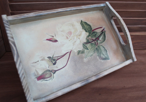 Dřevěný podnos o velikosti 29,5 x 19,5 cm, výška 3 cm. je vyroben ze smrkového, ručně drásaného a broušeného dřeva. Je opatřen obrázkem pomocí techniky decoupage, následně ručně domalováný. Dále je natřený dvoubarevným nátěrem, matným akrylovým lakem a specialním voskem pro snadnou údržbu.