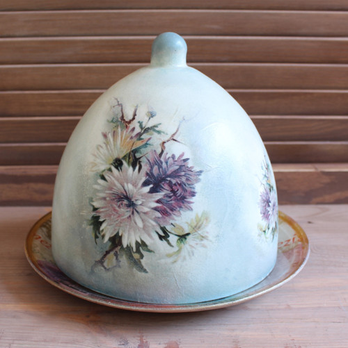 Skleněný poklop je určen ke stylovému servírování předkrmů, chuťovek, sýrů a dezertů. Poklop udrží zákusky, dezerty i jiné dobroty čerstvé, neosychají, nemůže na ně hmyz. Rozměry : průměr skla 18 cm, celková výška 18 cm. Ke zdobení je použita technika dekorovaní decoupage na sklo a ruční malba.