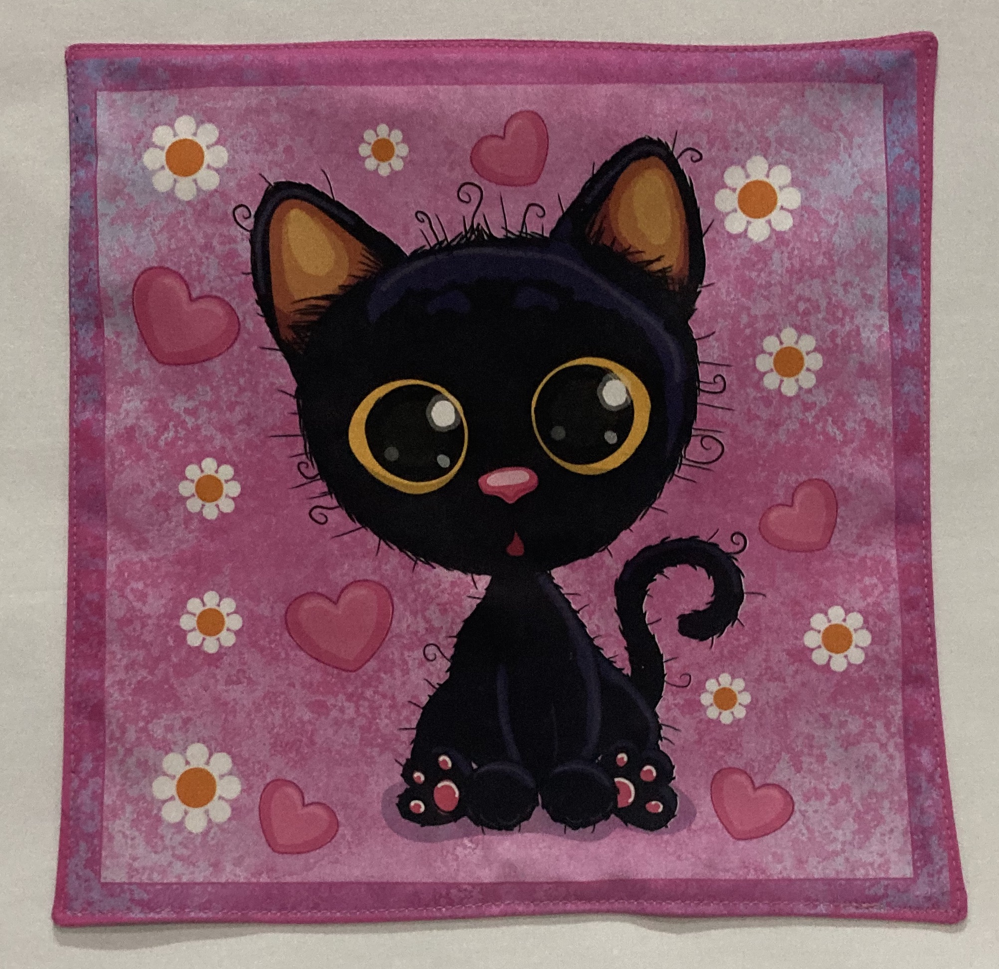 Ubrousek prostírání s obrázkem, ušitý z bavlněné látky. Obrázek je na jedné straně. Zadní strana je z bavlněné látky modré barvy.