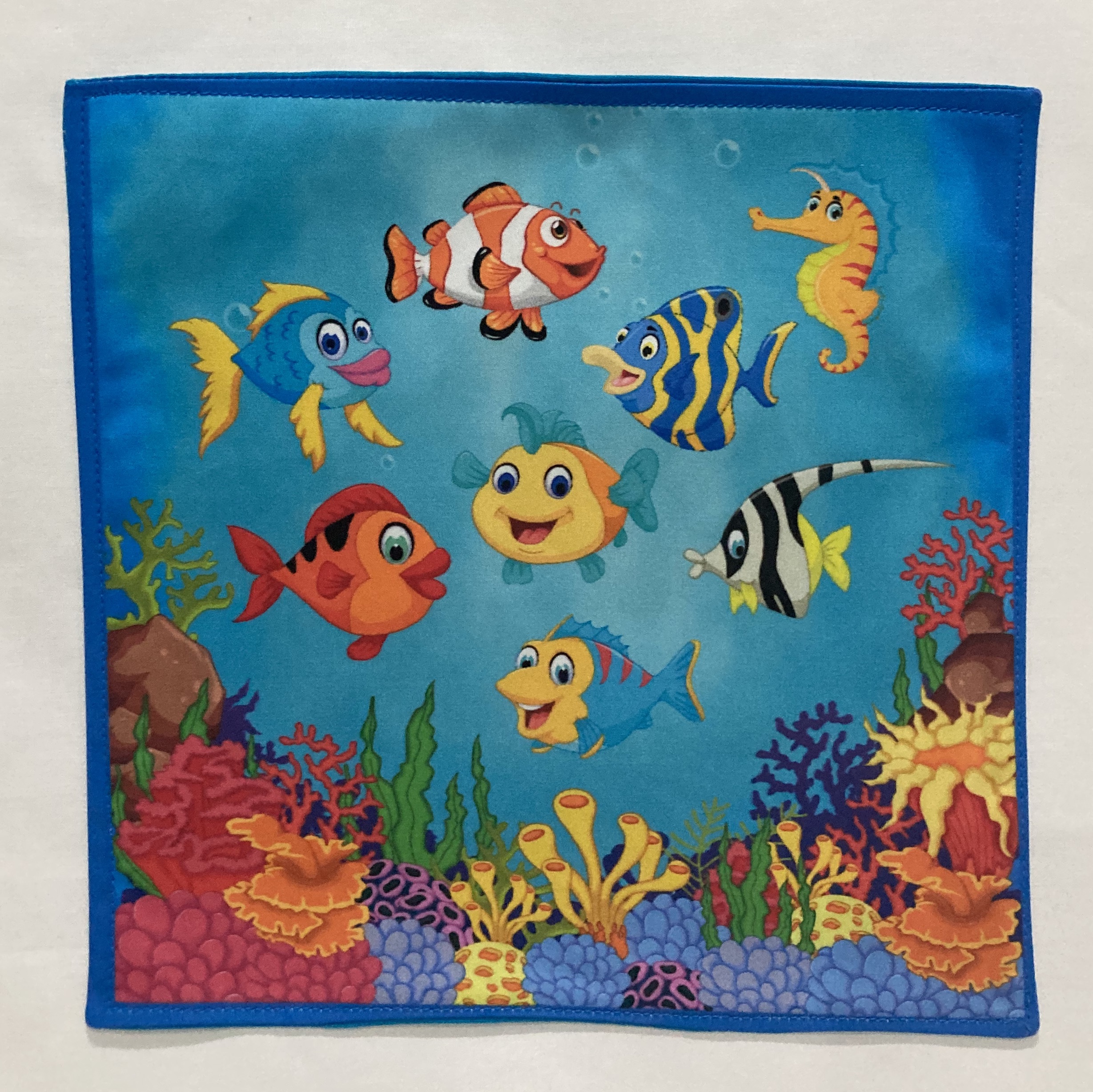 Ubrousek prostírání s obrázkem, ušitý z bavlněné látky. Obrázek je na jedné straně. Zadní strana je z bavlněné látky modré barvy.