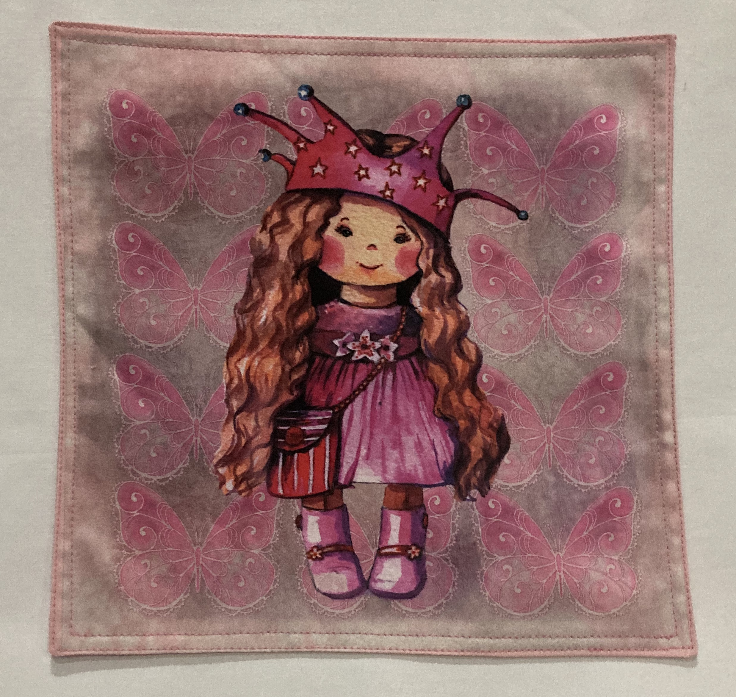 Ubrousek prostírání s obrázkem, ušitý z bavlněné látky. Obrázek je na jedné straně. Zadní strana je z bavlněné látky modré barvy.