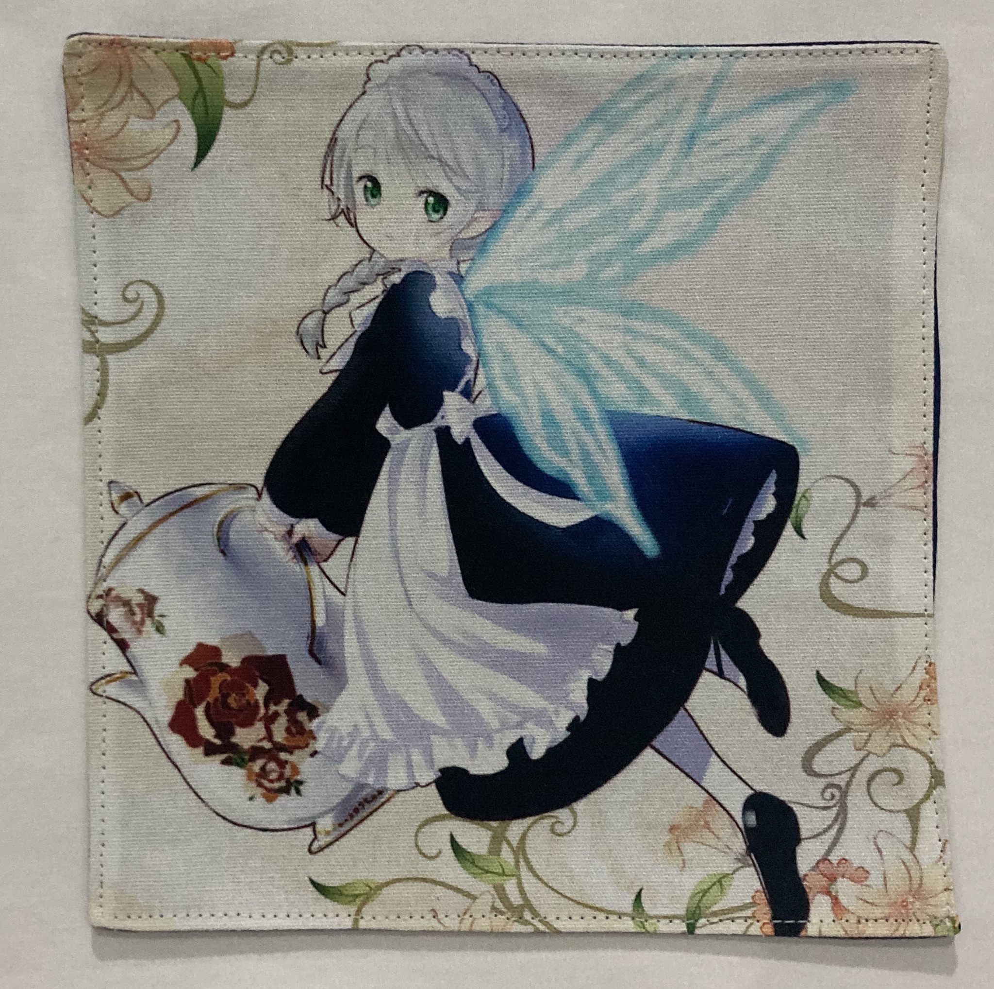 Ubrousek prostírání s obrázkem, ušitý z bavlněné látky. Obrázek je na jedné straně. Zadní strana je z bavlněné látky modré barvy.