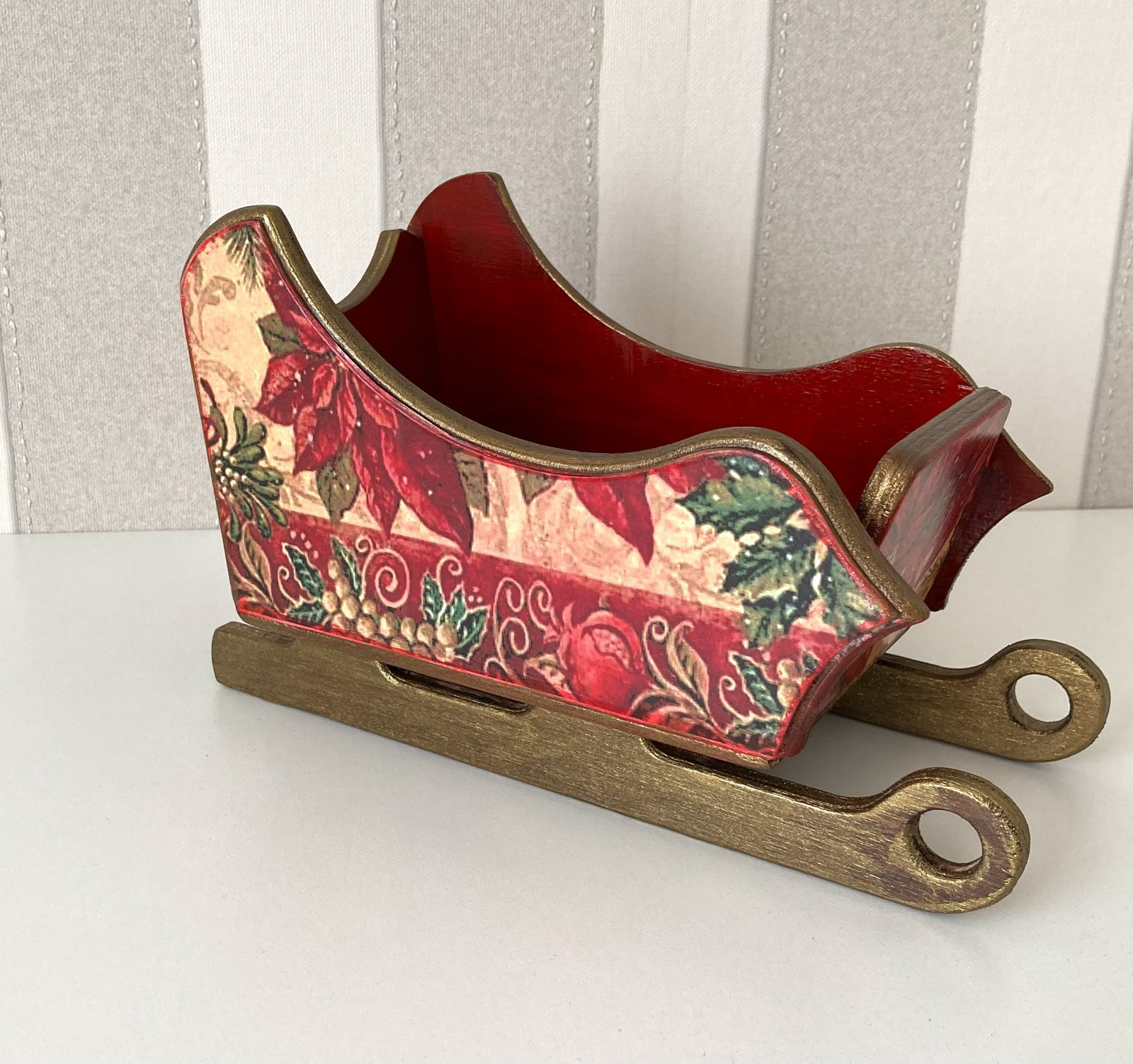 Ručně vyrobený podstavec na láhev, krabička na bonbony nebo na vánoční ozdoby. Je vyrobená z lipového dřeva a zdobená různými dekoračními technikami včetně techniky decoupage a ručně domalovaná. Je natřená akrylovými barvami a důkladně přelakován kvalitním akrylovým lakem . Je určená pro standartní láhev vína, šampaňského nebo jako nádoba na bonbóny. Lze otírat vlhkým hadříkem.