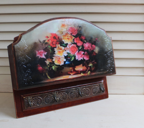 Multifunkční skříňka na klíče, šperky, dámské věci, apod. Lze zavěsit na chodbu a použít na klíče a korespondenci, nebo ji můžete pověsit u toaletního stolku – a pak si tam můžete pověsit oblíbené korálky, náhrdelníky a do kapsy dát štětce na make-up.