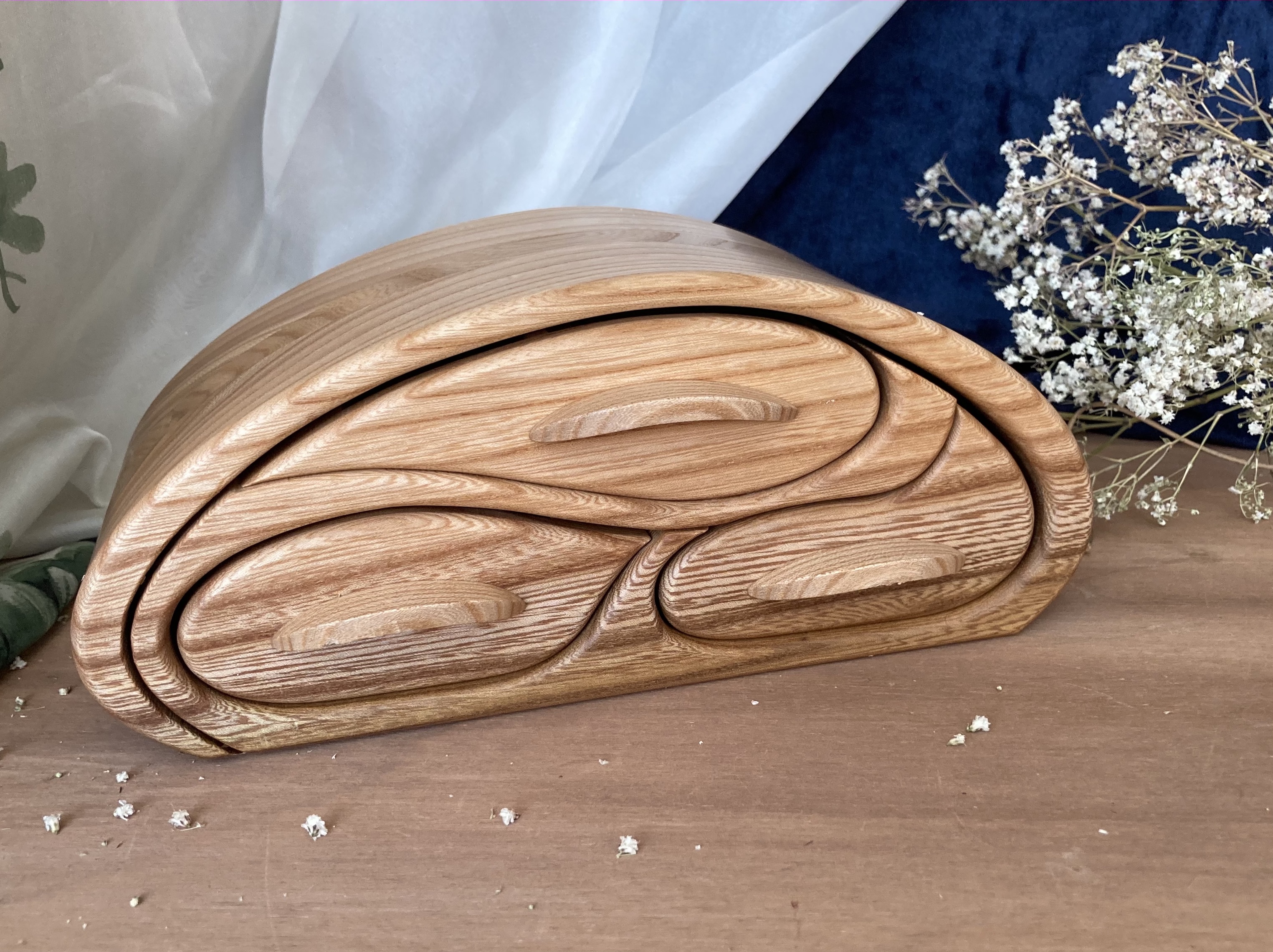 Šperkovnice Andromeda 01 je jedinečná, ručně vyrobená z masivu jilmu. Obsahuje 3 šuplíky. Zpracovaná vysoce kvalitním, odolným a absolutně ekologickým nátěrem. Šperkovnice velmi dobře zapadne do interiéru obývacího pokoje každé domácnosti. Originální a nevšední tip na dárek pro milovanou osobu k narozeninám, dárek pro maminku, přítelkyni či na svatbu nebo výročí. Při ukládání šperků do šperkovnice dochází k jejich čištění od negativní energie, zvláště pokud je nosíte denně. Přírodní dřevo má léčivé čistící vlastnosti a naplňuje atmosféru úžasnou lehkostí a dává vám živé teplo.