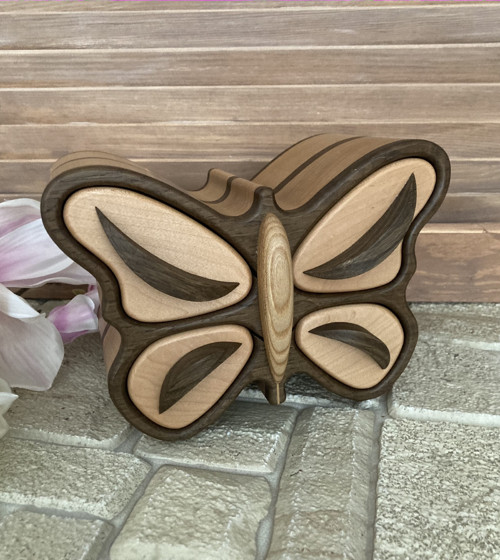 Šperkovnice motýl je jedinečná, vyrobená z různých typů dřeva: buk, dub a jasan. Obsahuje 4 šuplíky. Zpracovaná vysoce kvalitním, odolným a absolutně ekologickým nátěrem. Šperkovnice velmi dobře zapadne do interiéru obývacího pokoje každé domácnosti. Originální a nevšední tip na dárek pro milovanou osobu k narozeninám, dárek pro maminku, přítelkyni či na svatbu nebo výročí. Při ukládání šperků do šperkovnice dochází k jejich čištění od negativní energie, zvláště pokud je nosíte denně. Přírodní dřevo má léčivé čistící vlastnosti a naplňuje atmosféru úžasnou lehkostí a dává vám živé teplo. Motýl je symbolem lásky, štěstí a pohody.
