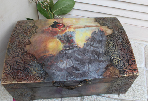 Velká, krásná, jedinečná, originální, romantická, dřevěná truhla na klíč, šperkovnice jako svatební dar nebo na velké poklady, šperky, hodinky apod. Je vyrobená z borovicového dřeva a je zdobená pomocí různých vytvarných technik. Krabička je natřena akrylovými barvami a důkladně přelakována akrylovým lakem. Lze otírat vlhkým hadříkem.