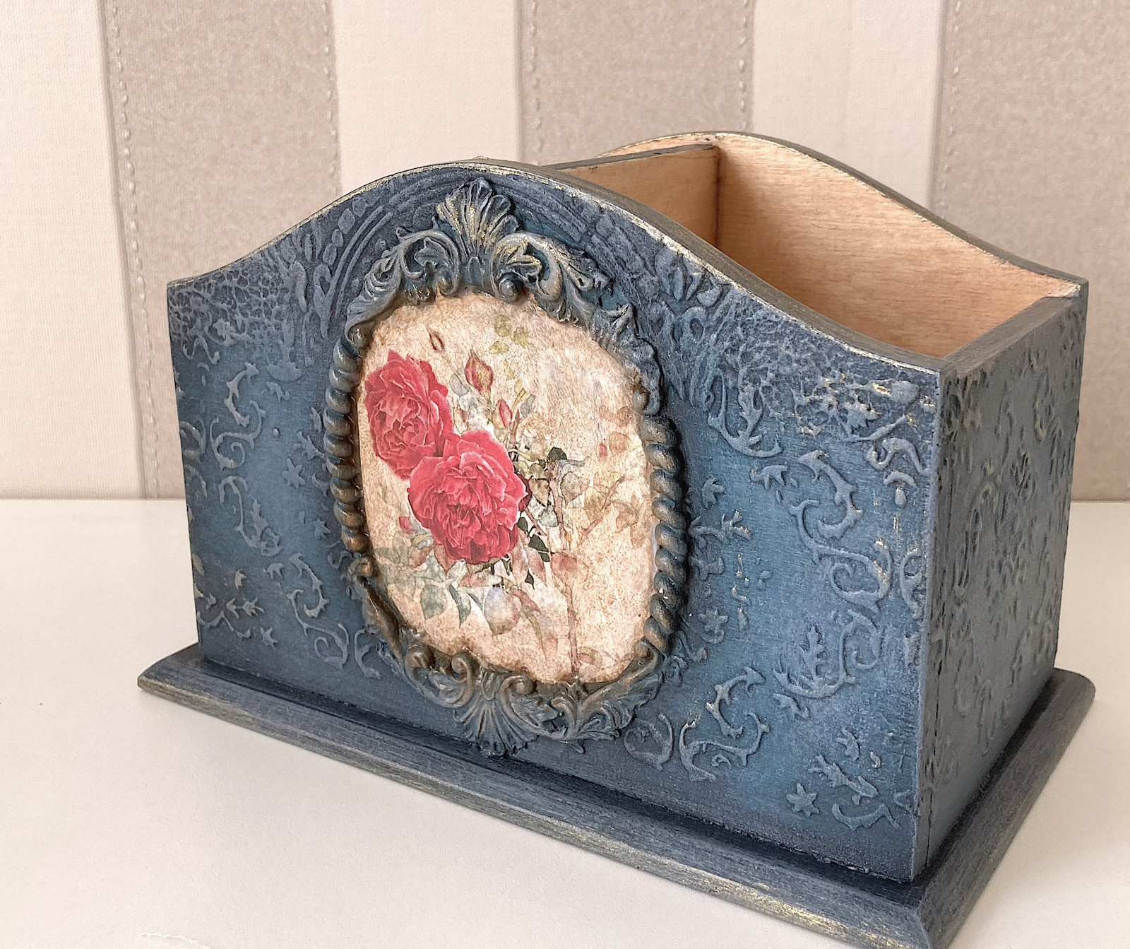 Můžete ho použit na psací potřeby, tužky, pera, núžky nebo kosmetické potřeby. Velmi praktický zásobník k posteli, do kuchyně, kanceláře nebo třeba na konferenční stolek. Stojánek je pomocí různých technik, techniky decoupage, patinovaný a důkladně přelakováný akrylovým lakem.