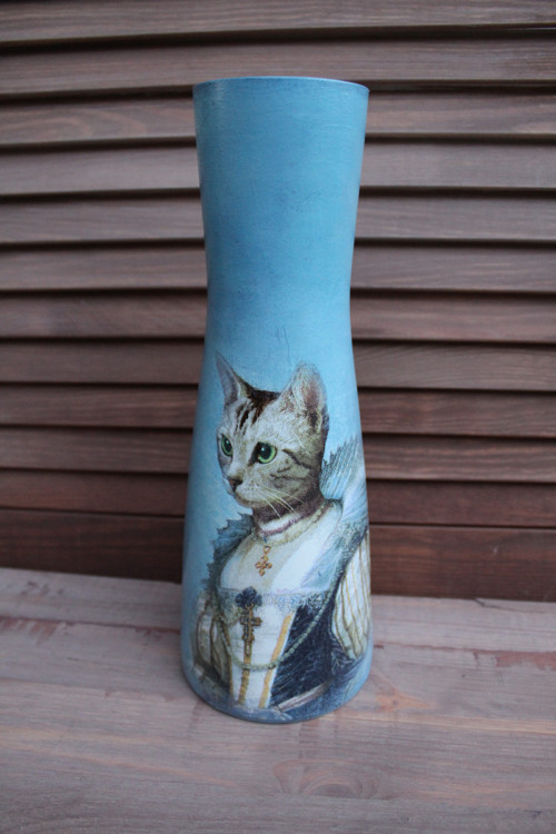Skleněná váza dekorovaná speciální technikou včetně náročné techniky decoupage na sklo a ručně domalovaná. Uvnitř váza zůstala skleněná. Můžete vázu mýt vlažnou vodou, uvnitř také, a jí se nic nestane.