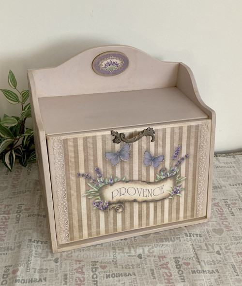 Schránka na chleba a pečivo, vyrobená z lipového dřeva. Vnitřní a zadní strana sololit. Lehce se otevírá i zavírá. Je zdobený pomocí různých technik, techniky decoupage a reliéfním vzorem. Dále je ručně domalovaný a natřený akrylovou barvou, akrylovým lakem a specialním voskem pro snadnou údržbu.Velmi pěkné a kvalitní provedení. Vnítřní čast je ošetřená speciálním olejem na kychyňská prkénka, takže je možné ho používat na potraviny. Ošetřený povrch je odolný vůči vínu, pivu, kole, kávě, čaji, ovocným šťávám, mléku a vodě, nezanechává stopy. Po zaschnutí je nátěr neškodný pro lidi. Používám jen akrylové barvy a akrylový lak s atestem na dětské hračky. Lze otírat vlhkým hadříkem a oplachovat vlažnou vodou.
