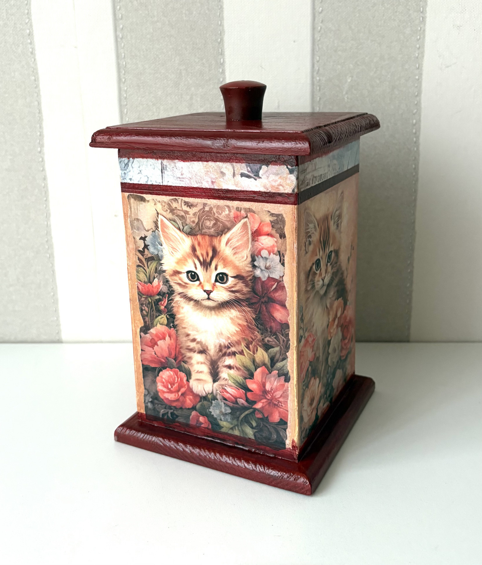 Dřevěná dóza s horním otevíráním. Rozměry: 21 x 10 x 10 cm. Krabička je zdobená technikou decoupage, barvená, lakováná kvalitním akrylovým lakem a natřená voskem. Uvnitř je přírodní. Používala jsem pouze ekologické materiály na vodní bázi. Design bočních stran není stejný, otočte krabice na druhou stranu a budete mít "novou" krabičku! Udělejte svůj domov ještě útulnějším a odlišným od všech ostatních! S ruční prací zacházejte opatrně. Používejte v suchých místnostech. Chraňte před nárazy, otírejte vlhkým a poté suchým hadříkem, také chraňte před přímým slunečním zářením. Omyjte pod tekoucí vodou, nechte osušit. Nenamáčejte a nemyjte v myčce.Každý výrobek je originál, drobné odchylky jsou žádoucí. Trhlinky, šmouhy či patina tedy nejsou vadou, ale znakem originality produktu. Škrábance a nerovnosti dodavají starobyly vzhled teto dóze.