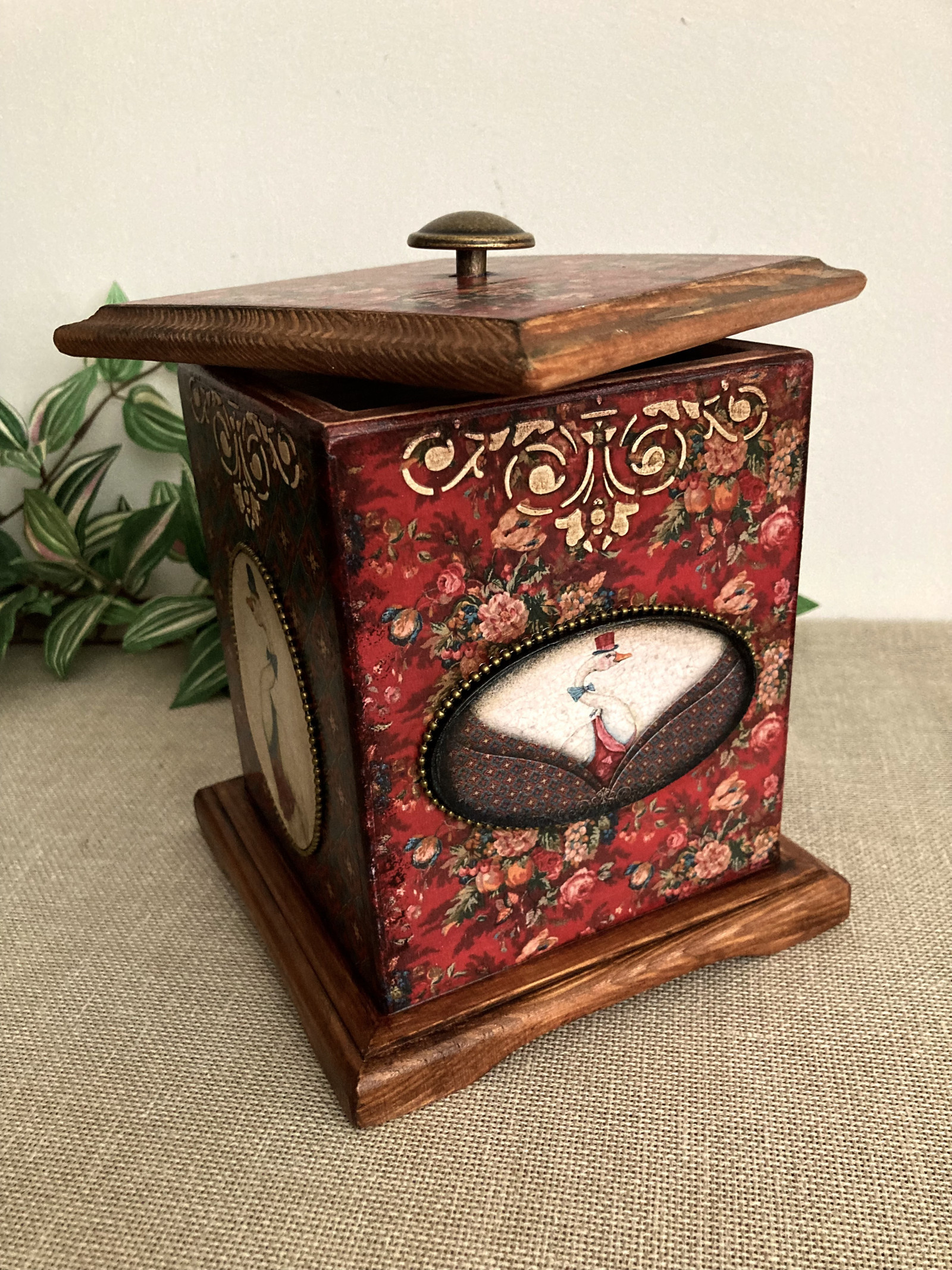 Krabička je zdobená technikou transfer bavlněné látky na dřevěný povrch, mořená, lakováná kvalitním akrylovým lakem a natřená voskem. Uvnitř je přírodní. Používala jsem pouze ekologické materiály na vodní bázi.