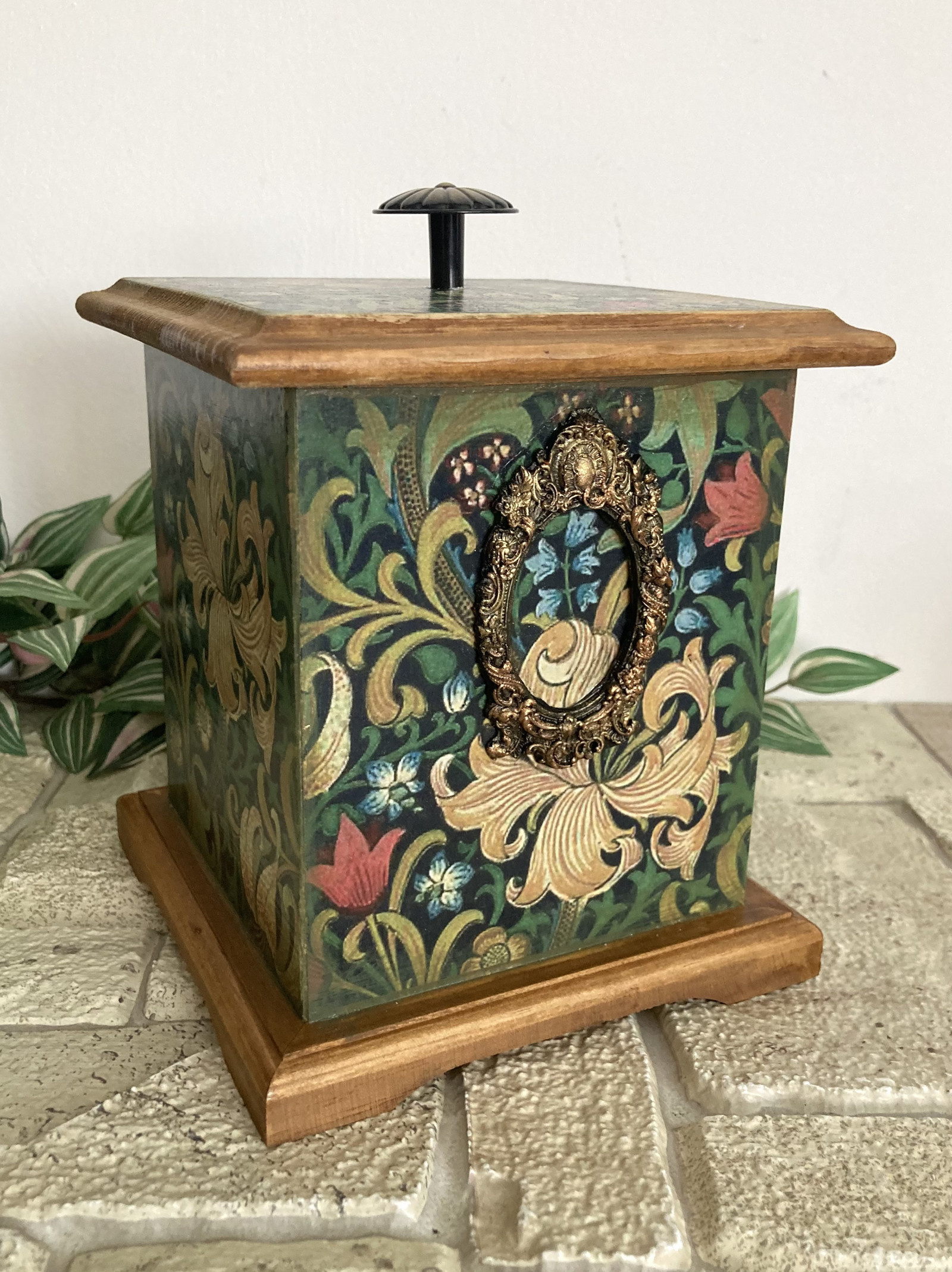 Krabička je zdobená technikou transfer bavlněné látky na dřevěný povrch, mořená, lakováná kvalitním akrylovým lakem a natřená voskem. Uvnitř je přírodní. Používala jsem pouze ekologické materiály na vodní bázi.