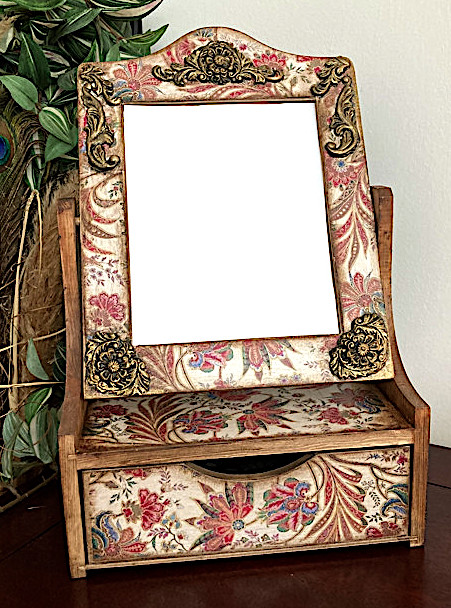 Dřevěná toaletka - šperkovnice se zrcadlem, která se bude hodit pro uschování různých drobností, sponek, prstýnků, korálků atd. Je to pěkný dárek i pro každou ženu. Šperkovnice ozdobí každou ložnici a kosmetický stůl. Má vysouvací šuplíček do kterého můžete ukládat například šperky, prstýnky nebo kosmetické potřeby.Toaletka je vyrobena z kvalitního borovicového dřeva a borovicové překližky. Je zdobena pomocí různých technik a techniky decoupage. Dále je natřená akrylovou barvou, akrylovým lakem a specialním voskem pro snadnou údržbu.Velmi pěkné a kvalitní provedení.