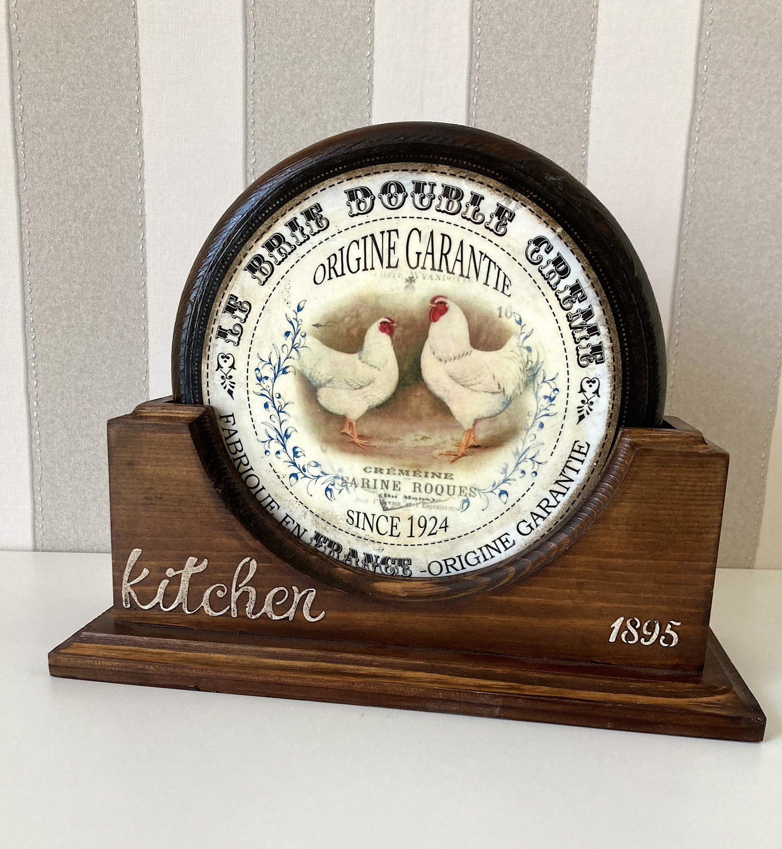 Dřevěné prkénko je nezbytným pomocníkem v kuchyni. Díky svému originálnímu designu je výborným doplňkem při servírování. Dřevěná prkénka mají průměr 24 сm a tloušťku 2 cm. Celkové rozměry se stojanem 30 x 12,5 x 28 cm.