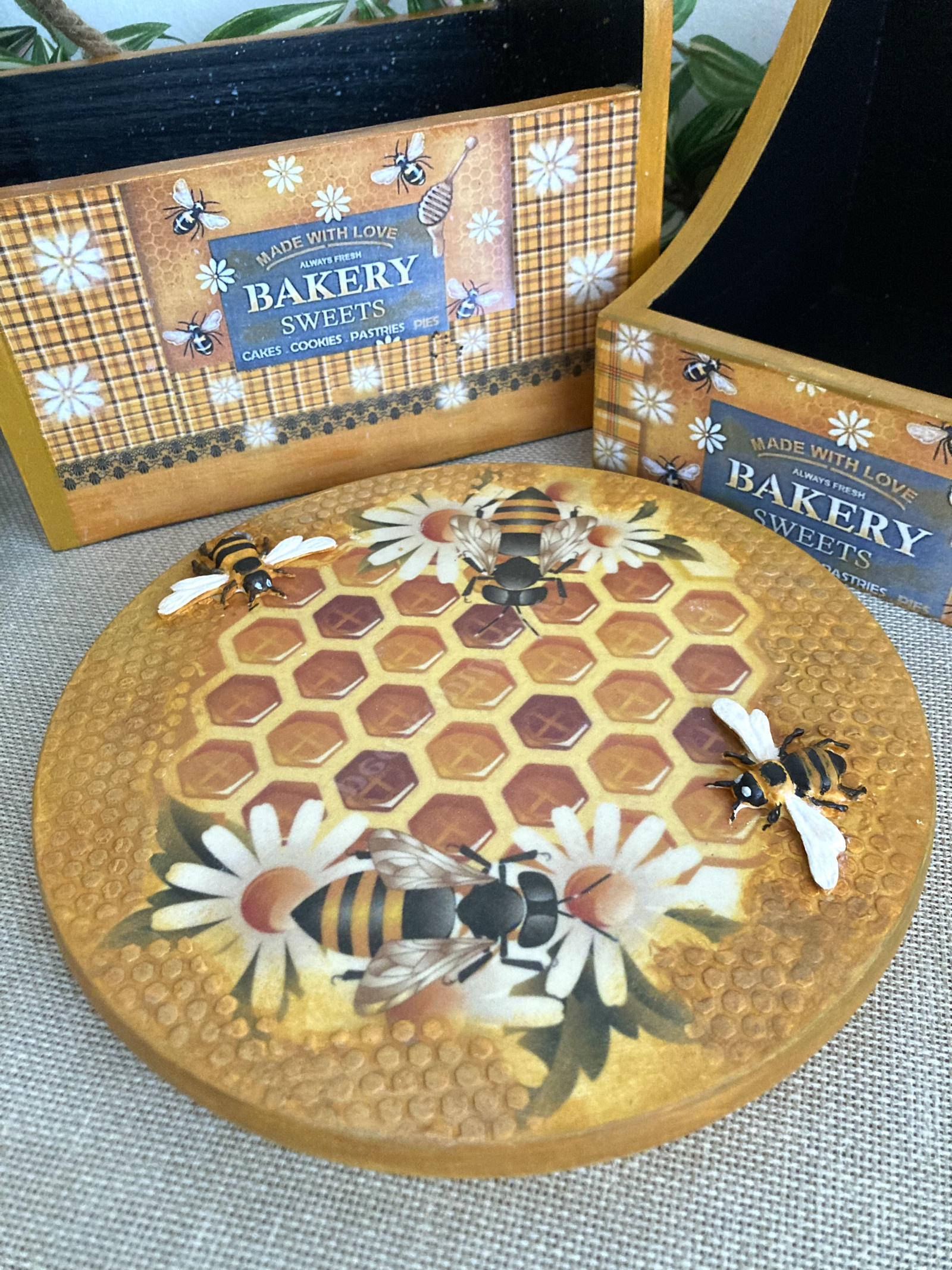 Dřevěné prkénko je nezbytným pomocníkem v kuchyni. Díky svému originálnímu designu je výborným doplňkem při servírování či na párty. Dřevěné prkénko o průměru 20 сm a tloušťce 1,5 cm. Je vyrobeno z prvotřídního bukového dřeva, ozdobeno technikou decoupage, objemným vzorem, ručně vyrobenými elementy ve tvaru včel, patinovano a lakovano kvalitním akrylovým lakem. Obrázek je nesmyvatelný.