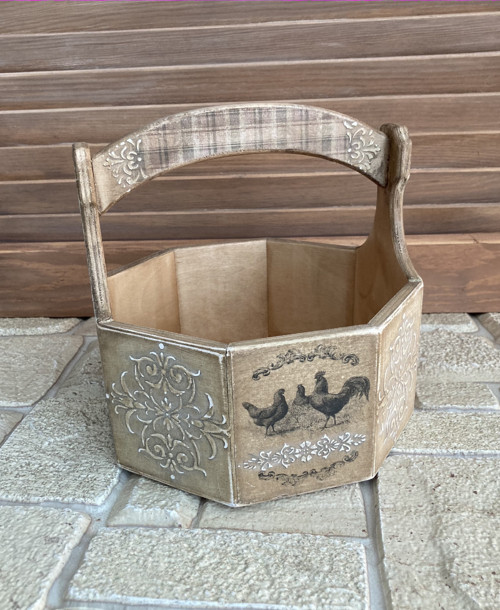 Dřevěný košík na velikonoční vajíčka, ovoce, sladkosti, atd. Je vyrobený ze smrkového dřeva, opatřený obrázkem pomocí techniky decoupage (transfer obrázku) a následně ručně domalovaný. Uvnitř je natřený mořidlem a speciálním olejem na kuchyňská prkénka, takže je možné ho používat na potraviny. Strana s obrázkem je nalakovaná kvalitním lakem s atestem na dětské hračky. Lze otírat vlhkým hadříkem.