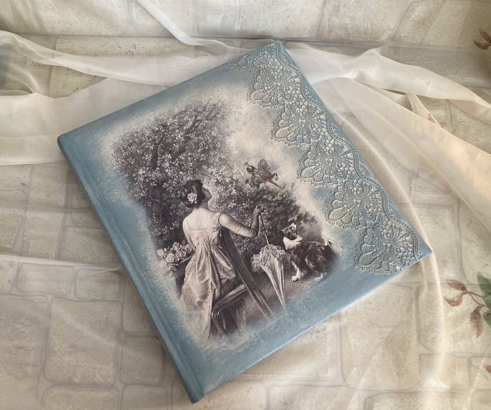 Fotoalbum samolepící, pro fotografie o rozměrech 9 × 13 cm, 10 × 15 cm, 13 × 18 cm a 10 × 18 cm, pro max. 700 ks fotografií, 27 listů - 54 stran, 29 cm × 31 cm (V׊). K připevnění fotek poslouží samolepicí plošky. Fotoalbum je zdobené technikou decoupage a ručně vyrobenou elastickou krajkou.