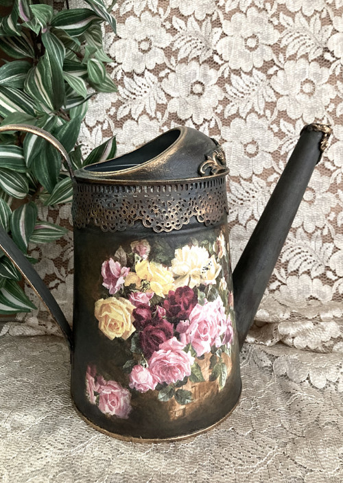 Plechová konev je vyrobená z galvanizované oceli, která poskytuje kvalitní ochranu proti korozi. Je zdobená technikou dekorování se starožitným efektem, ručně vyrobenou elastickou krajkou, je natřená akrylovými barvami, patinovaná a důkladně přelakovaná kvalitním akrylovým lakem. Kombinace zlaté a tyrkisové patiny dodává konvici zvláštní něžnost a lehkost. Konev je vhodná jak na zalévání, tak i na suché květiny. Můžete ji použít jako doplněk do bytu. Konev může ozdobit váš domov, vnést do něj teplo a pohodlí, lásku a romantiku. Bude to originální dárek a nádherná dekorace do interiéru vašeho domova, bytu či letní chaty.