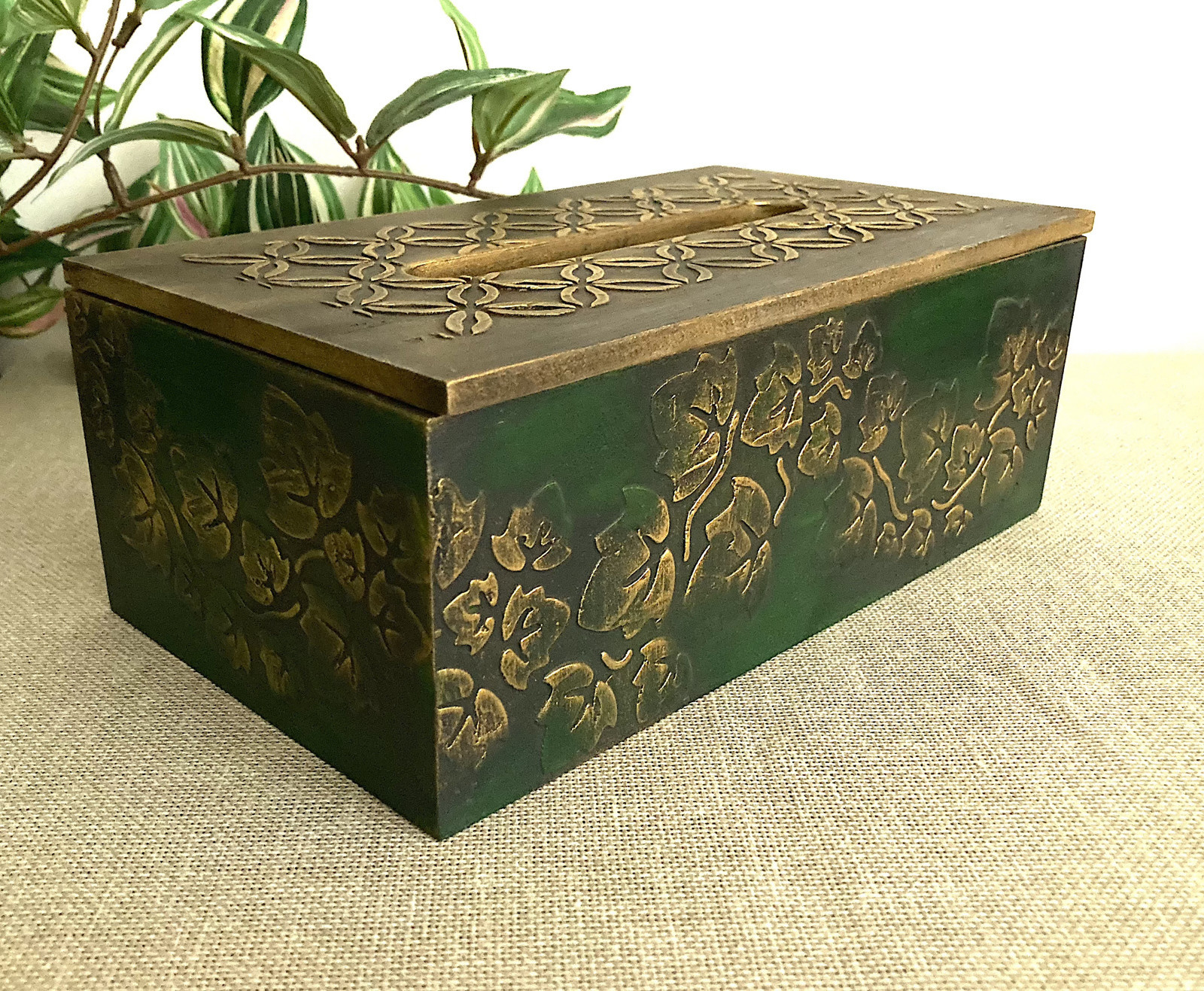 Dřevěná krabička na papírové kapesníky je zdobená pomocí různých technik. Je vyrobena ze dřeva . Je v jemných tónech, zdobená objemným vzorem a patinována. Dřevěná krabička na kapesníky dokáže ozdobit jak sváteční stůl, tak i toaletní stolek v ložnici. Zespod výsuvné dno. Má vrchní otevírání s panty.