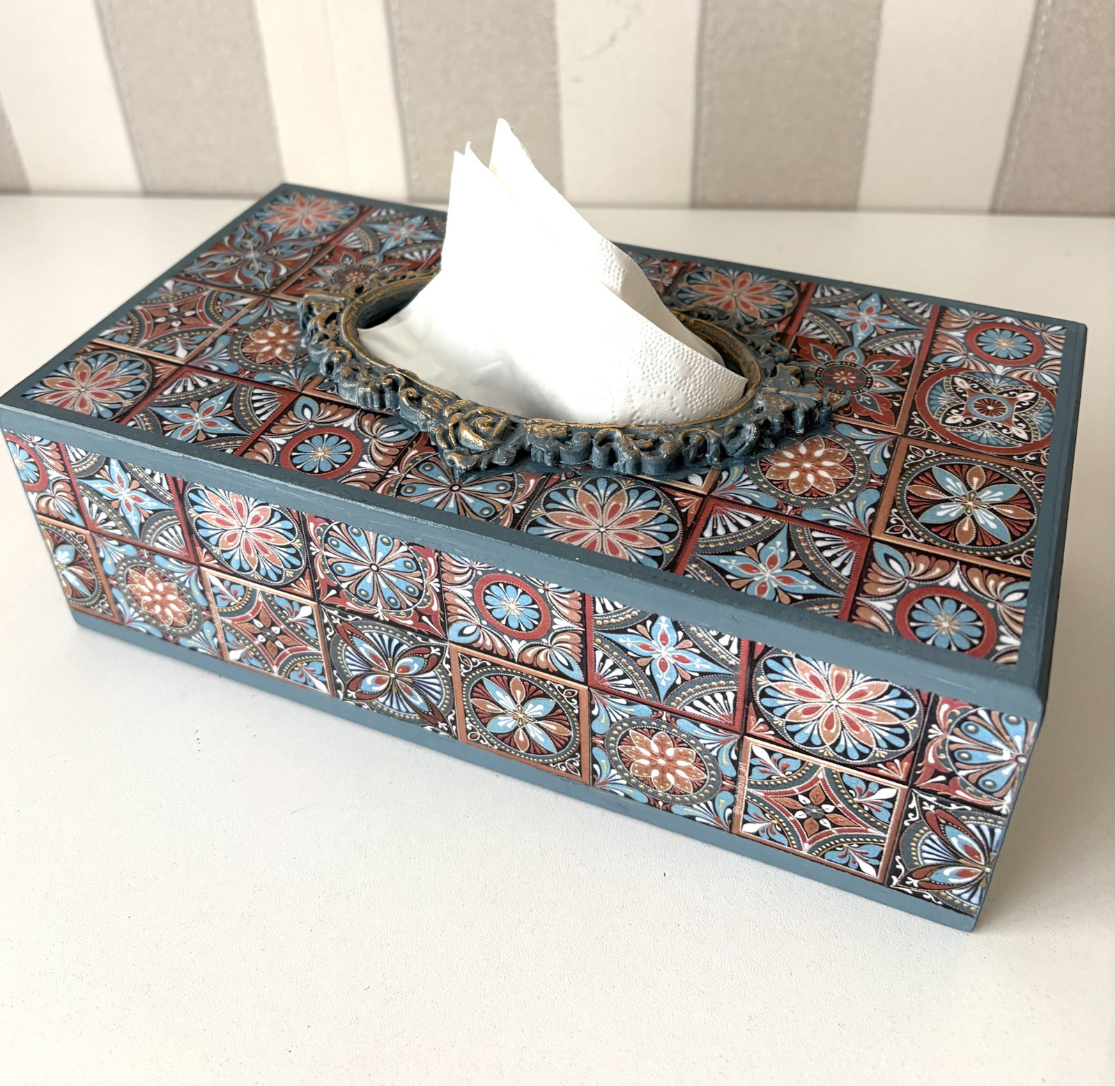 Dřevěná krabička na papírové kapesníky má vysouvací dno, je zdobená pomocí různých technik včetně techniky decoupage a zdobená ručně vyrobanými elementy. Krabička na kapesníky dokáže ozdobit jak sváteční stůl, tak i toaletní stolek v ložnici.