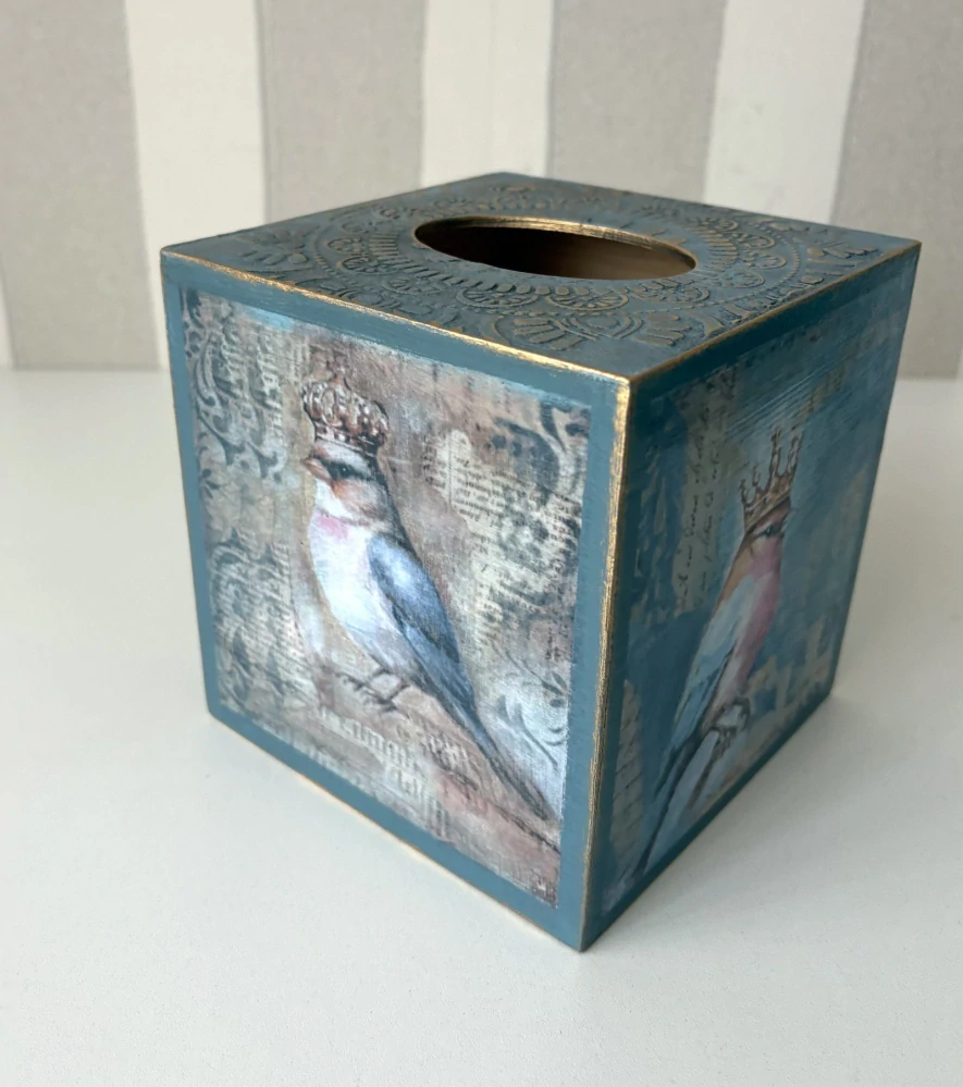 Dřevěná krabička na kapesníky je zdobená pomocí různých technik, včetně techniky decoupage, patinovaná, lakovaná a voskovaná. Je zdobená objemným vzorem. Je vyrobena z jehličnatého dřeva - borovice, jedle. Dřevěná krabička na kapesníky dokáže ozdobit jak sváteční stůl, tak i toaletní stolek v ložnici.
