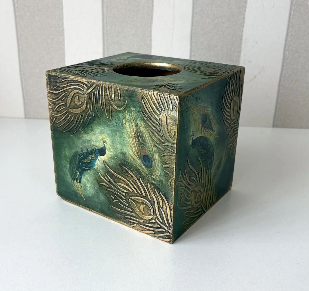 Dřevěná krabička na kapesníky je zdobená pomocí různých technik, včetně techniky decoupage patinovaná, lakovaná a voskovaná. Je zdobená objemným vzorem. Je vyrobena z jehličnatého dřeva - borovice, jedle. Dřevěná krabička na kapesníky dokáže ozdobit jak sváteční stůl, tak i toaletní stolek v ložnici.