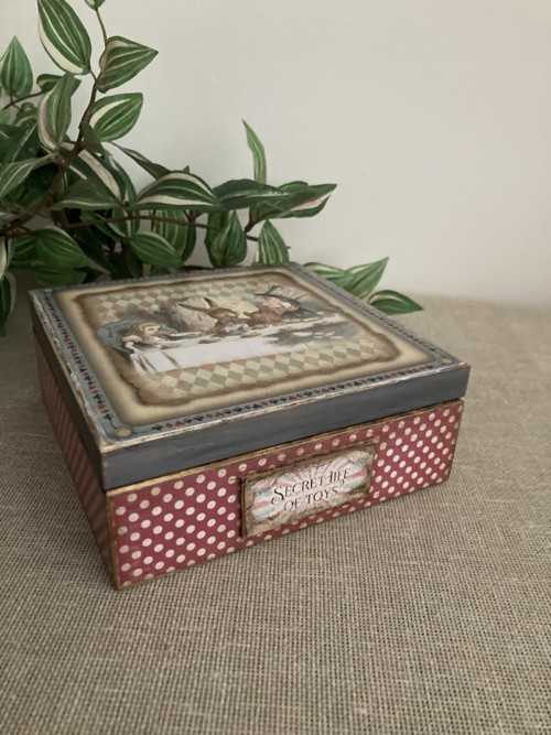 Dřevěná krabička s horním otevíráním. Je zdobena pomocí různých technik, hlavně technikou decoupage, je barvená a ručně domalovaná . Povrch je lakován kvalitním akrylovým lakem. Lze otírat vlhkým hadříkem.
