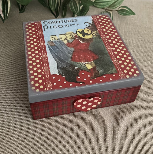 Dřevěná krabička s horním otevíráním. Je zdobena pomocí různých technik, hlavně technikou decoupage, je barvená a ručně domalovaná . Povrch je lakován kvalitním akrylovým lakem. Lze otírat vlhkým hadříkem.